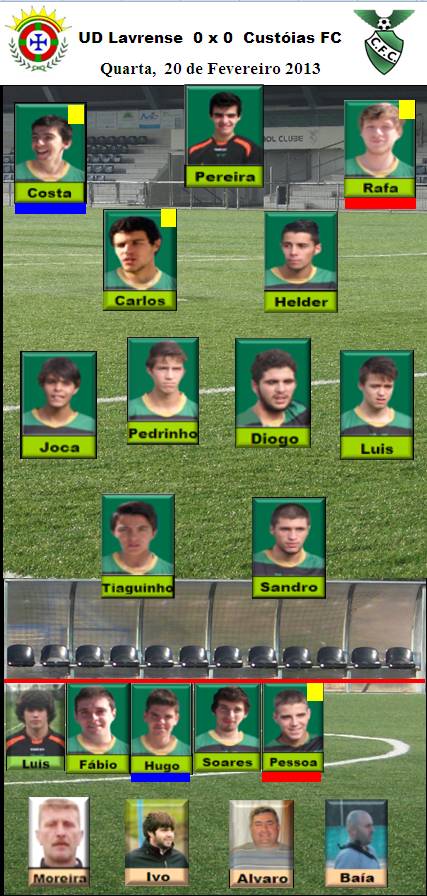 Hoje quarta-feira, realizou-se o jogo em atraso, contra o UD Lavrense. Com uma entrada muito boa por parte do Custóias, a jogar em 4 x 4 x 2 com os laterais (Rafa e Costa) a subir nos seus corredor em apoio á linha avançada e com Carlos e Helder a comandarem a defesa. No meio campo Pedrinho, Diogo e luis estavam a controlar o mesmo dando espaço de manobra ao Joca para comandar o jogo ofensivo, aonde Sandro e Tiago estavam a corresponder, adivinhava-se um bom jogo. Com um futebol objetivo e dominante o Custóias poderia inaugurar o marcador a qualquer momento, tal não aconteceu por demérito dos nossos avançados e mérito do guarda-redes do Lavrense.
